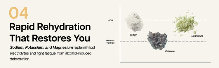 Our unique blend harnesses natural actives and essential vitamins that help you recover and bounce back fast. It boosts your metabolism and replenishes what alcohol drains - hydration, energy, clarity - so that you wake up without the “weight.”
